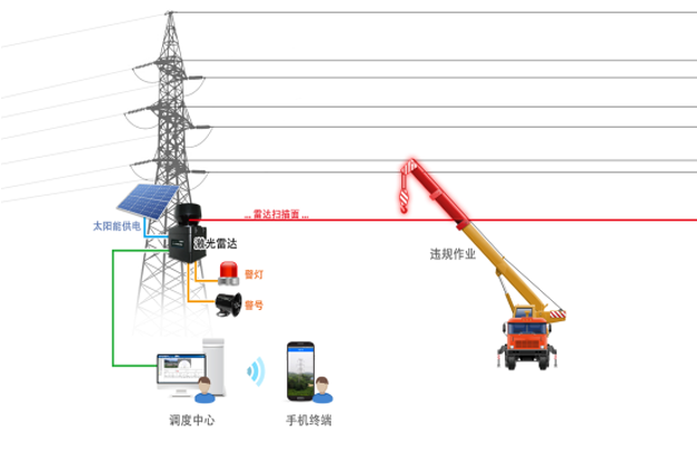 天河電子基于激光雷達的架空輸電線路防護系統,旨在彌補視頻監控技術、傳感器報警技術被動防御的特性和智能圖像分析技術在環境應用中的局限性,利用激光雷達主動防御的特性,結合高清視頻監控技術,對闖入電力高壓線下3-5米目標(如違章作業吊車)進行定位、跟蹤、放大,現場警示違章作業人員,同時上傳告警視頻或圖片給監管單位進行相應警情處置。
